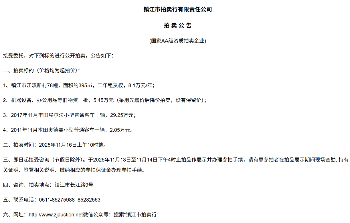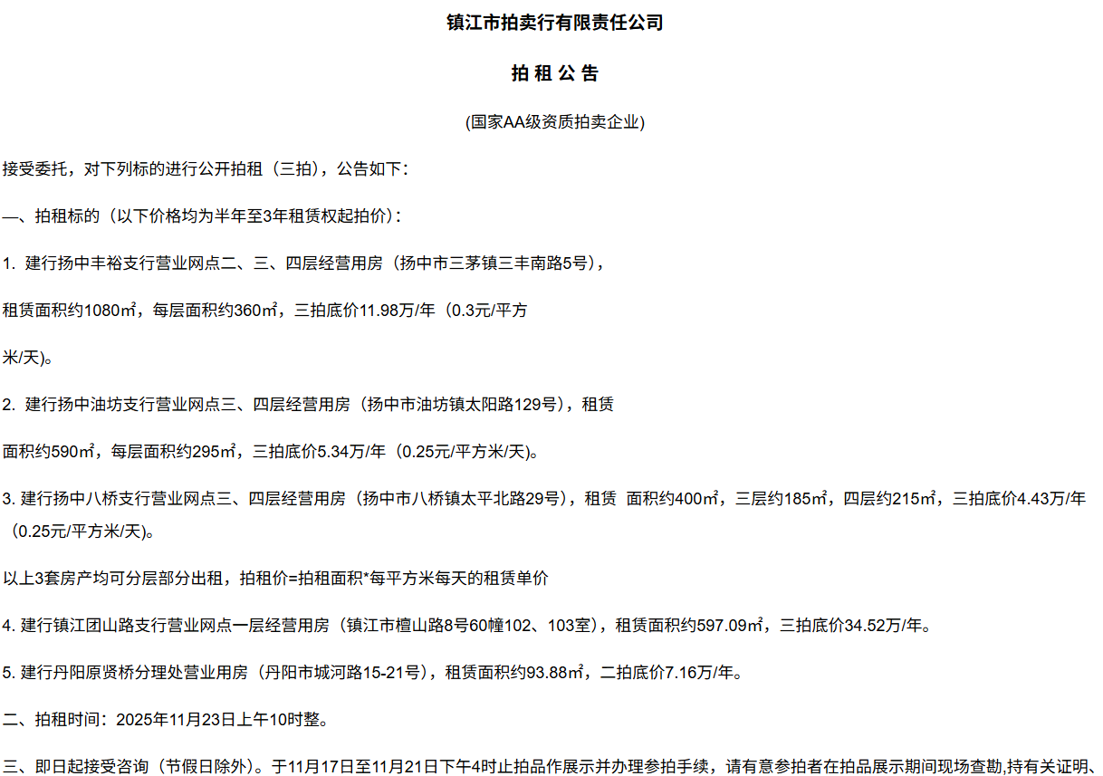 鎮江市拍賣行有限責任公司拍 租 公 吿(國家AA級資質拍賣企業)接受委托,對下列標的進行公開拍租(三拍),公告如下:—、拍租標的(以下價格均為半年至3年租賃權起拍價):1.  建行揚中豐裕支行營業網點二、三、四層經營用房(揚中市三茅鎮三豐南路5號),租賃面積約1080㎡,每層面積約360㎡,三拍底價11.98萬/年(0.3元/平方米/天)。2.  建行揚中油坊支行營業網點三、四層經營用房(揚中市油坊鎮太陽路129號),租賃面積約590㎡,每層面積約295㎡,三拍底價5.34萬/年(0.25元/平方米/天)。3. 建行揚中八橋支行營業網點三、四層經營用房(揚中市八橋鎮太平北路29號),租賃  面積約400㎡,三層約185㎡,四層約215㎡,三拍底價4.43萬/年(0.25元/平方米/天)。以上3套房產均可分層部分出租,拍租價=拍租面積*每平方米每天的租賃單價4. 建行鎮江團山路支行營業網點一層經營用房(鎮江市檀山路8號60幢102、103室),租賃面積約597.09㎡,三拍底價34.52萬/年。5. 建行丹陽原賢橋分理處營業用房(丹陽市城河路15-21號),租賃面積約93.88㎡,二拍底價7.16萬/年。二、拍租時間:2025年11月23日上午10時整。三、即日起接受咨詢(節假日除外)。于11月17日至11月21日下午4時止拍品作展示并辦理參拍手續,請有意參拍者在拍品展示期間現場查勘,持有關證明、簽署相關說明、繳納相應的參拍保證金辦理參拍手續。四、咨詢、拍租地點:鎮江市長江路9號五、聯系方式:0511-85275988   13655299933楊先生六、網址:http://www_zjauction_net.rjgb.net.cn;微信公眾號:搜索“鎮江市拍賣行” 拍品清單2025.11.23序號名稱起拍價(元)標的說明1建行揚中豐裕支行營業網點二、三、四層經營用房(揚中市三茅鎮三豐南路5號),租賃面積約1080㎡,每層面積約360㎡三拍底價11.98萬/年(0.3元/平方米/天)1、1-3號房產均可分層部分出租,拍租價=拍租面積*每平方米每天的租賃單價;2、意向競拍人在拍賣前需持營業執照或身份證與委托方說明租賃房產經營業態,確定意向后出具房產承租用途承諾書,經委托方審核后,方可交納保證金參加競拍;3、租賃期限為半年至3年(承租方與出租方協商而定),承租方每半年或一年結付租金,租賃期間的水、電費用及其它相關費用均由承租方承擔;4、承租方不得用于經營和保管危險物品,不得用于開設餐飲、娛樂等可能嚴重影響消防安全、運營安全的經營業態,不得用于經營委托貸款、小額貸款等可能冒用委托方名義,帶來聲譽風險的經營業態。租賃期內,承租方不得破壞墻體結構,自行成就消防、安全等使用條件,不得擅自將租賃房屋轉租、轉讓給他人使用,否則委托方有權收回房屋;5、拍租成交后,承租方將租金交至出租方指定賬戶,傭金交至拍賣方賬戶(拍租傭金為該房屋一個月租金)。承租方憑租賃合同無息退還保證金。2建行揚中油坊支行營業網點三、四層經營用房(揚中市油坊鎮太陽路129號),租賃面積約590㎡,每層面積約295㎡三拍底價5.34萬/年(0.25元/平方米/天)3建行揚中八橋支行營業網點三、四層經營用房(揚中市八橋鎮太平北路29號),租賃面積約490㎡,每層面積約245㎡三拍底價4.43萬/年(0.25元/平方米/天)4建行鎮江團山路支行營業網點一層經營用房(鎮江市檀山路8號60幢102、103室),建筑面積約597.09㎡三拍底價34.52萬/年5建行丹陽原賢橋分理處營業用房(丹陽市城河路15-21號),建筑面積約93.88㎡二拍底價7.16萬/年